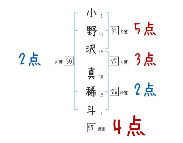 総運![]() | 小野沢真稀斗さんの総運は57画の4つ星!向上心があり人望がある。地位を得る。 あなたの人生を表す1番重要な運勢です。生涯を通じて影響する総合運となり、主に50歳以降の晩年期に影響を及ぼします。 |