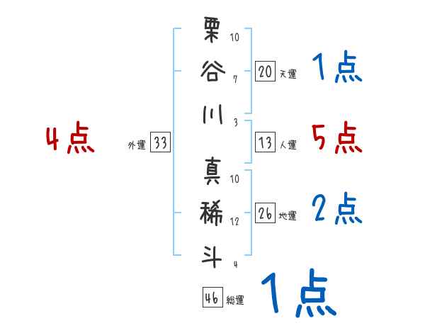 総運![]() | 栗谷川真稀斗さんの総運は46画の1つ星!迷走することが多く苦労するかも。目先のことにとらわれないように。 あなたの人生を表す1番重要な運勢です。生涯を通じて影響する総合運となり、主に50歳以降の晩年期に影響を及ぼします。 |