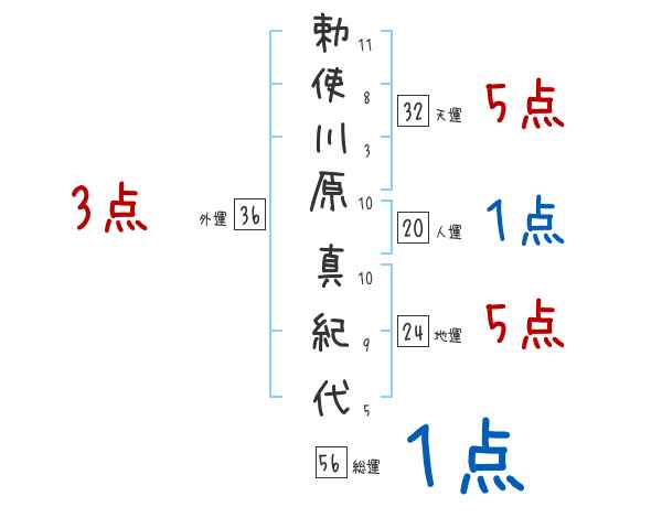 天運![]() | 勅使川原真紀代さんの天運は32画の5つ星!柔軟性があり成功する。チャンスが多く金運が良い。 家系が持つ宿命的な運勢を表します。祖先から受け継いだ苗字ですので自分の力が及びません。家柄を象徴します。 |