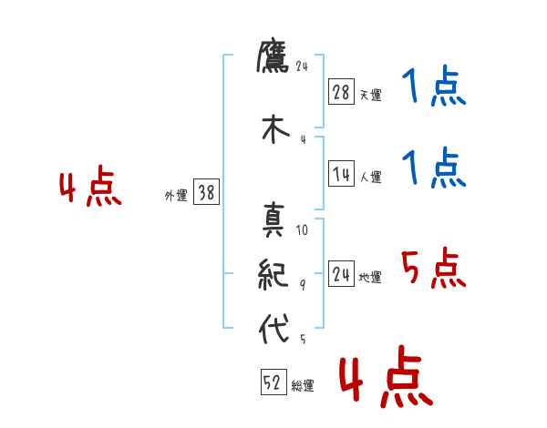 外運![]() | 鷹木真紀代さんの外運は38画の4つ星!温厚な性格で技術的な才能を発揮する。職人的な仕事に向いている。 生活面を象徴する運勢です。外部から受ける影響力を表し、結婚運、家庭運や職場、環境への順応性を表します。 |