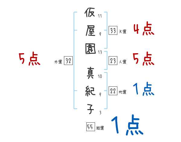 外運![]() | 仮屋園真紀子さんの外運は32画の5つ星!柔軟性があり成功する。チャンスが多く金運が良い。 生活面を象徴する運勢です。外部から受ける影響力を表し、結婚運、家庭運や職場、環境への順応性を表します。 |