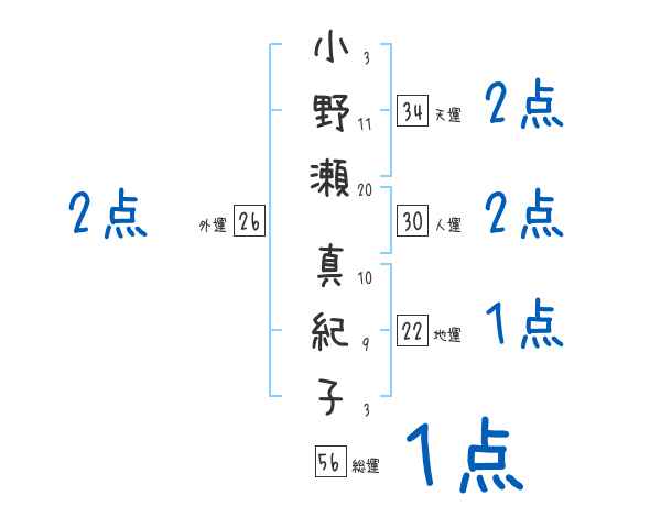 総運![]() | 小野瀬真紀子さんの総運は56画の1つ星!消極的で無気力になりがち。誠実な気持ちが必要でしょう。 あなたの人生を表す1番重要な運勢です。生涯を通じて影響する総合運となり、主に50歳以降の晩年期に影響を及ぼします。 |