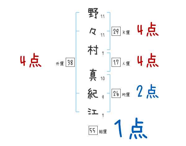 天運![]() | 野々村真紀江さんの天運は29画の4つ星!完全主義で才能がある。厳格な心の持ち主。 家系が持つ宿命的な運勢を表します。祖先から受け継いだ苗字ですので自分の力が及びません。家柄を象徴します。 |
