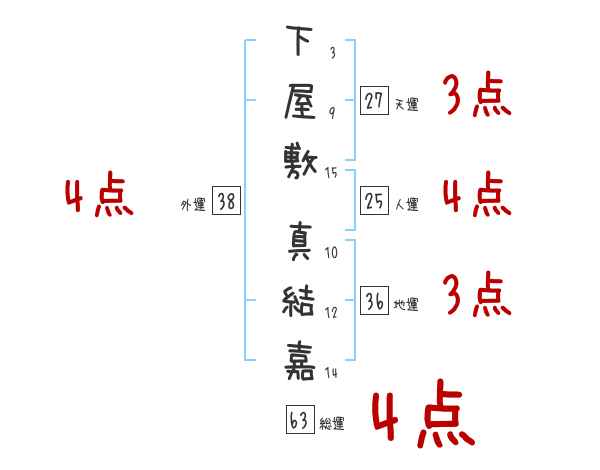 天運![]() | 下屋敷真結嘉さんの天運は27画の3つ星!頭脳明晰だが強情で摩擦が多い傾向。孤立に注意。 家系が持つ宿命的な運勢を表します。祖先から受け継いだ苗字ですので自分の力が及びません。家柄を象徴します。 |