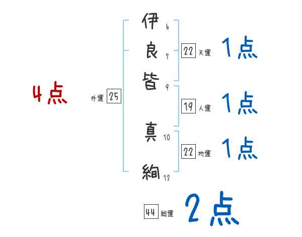 総運![]() | 伊良皆真絢さんの総運は44画の2つ星!誠実で慎重な性格。物事を考えすぎないように注意しましょう。 あなたの人生を表す1番重要な運勢です。生涯を通じて影響する総合運となり、主に50歳以降の晩年期に影響を及ぼします。 |