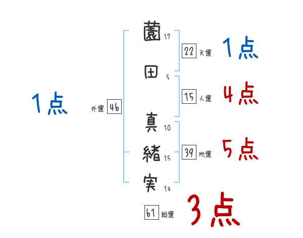 外運![]()  | 薗田真緒実さんの外運は46画の1つ星!迷走することが多く苦労するかも。目先のことにとらわれないように。 生活面を象徴する運勢です。外部から受ける影響力を表し、結婚運、家庭運や職場、環境への順応性を表します。 |