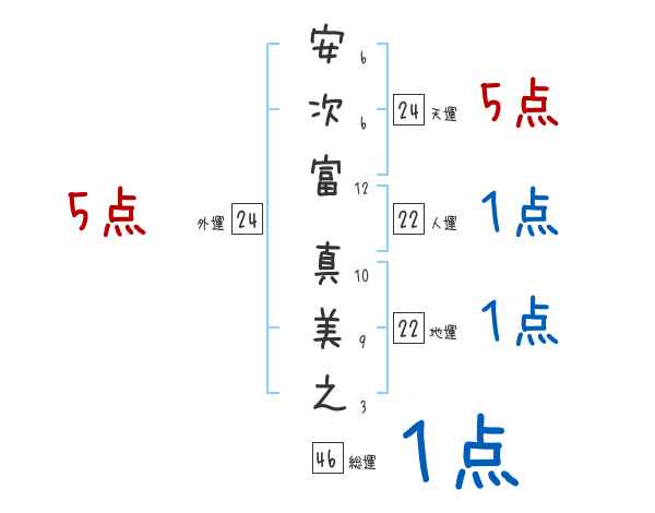 外運![]() | 安次富真美之さんの外運は24画の5つ星!家庭運が良く順調な人生。金運にも恵まれる。 生活面を象徴する運勢です。外部から受ける影響力を表し、結婚運、家庭運や職場、環境への順応性を表します。 |