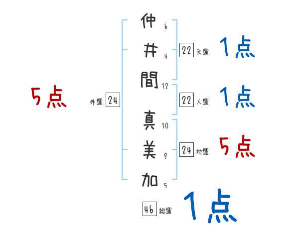 人運![]() | 仲井間真美加さんの人運は22画の1つ星!努力することが苦手ないっぽう手先が器用。芸術性にも優れる。 性格や才能などを表す2番目に重要な運勢です。人間関係や協調性、社会的な成功に影響します。主に20歳から50歳ぐらいまでの中年期の運勢を表します。 |