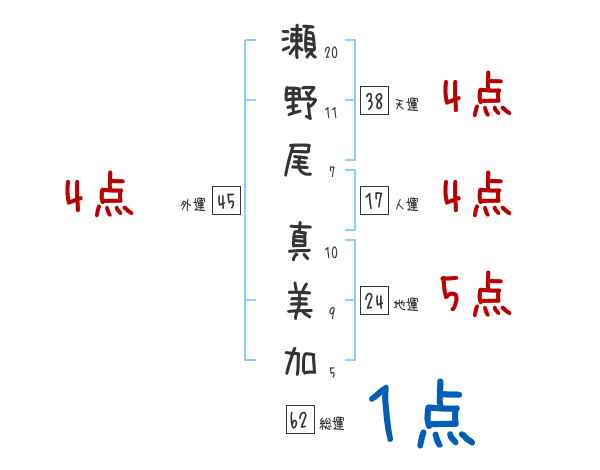 総運![]() | 瀬野尾真美加さんの総運は62画の1つ星!困難なトラブルが多く精神的に疲労しないように気をつけましょう。 あなたの人生を表す1番重要な運勢です。生涯を通じて影響する総合運となり、主に50歳以降の晩年期に影響を及ぼします。 |