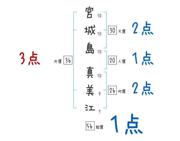 外運![]() | 宮城島真美江さんの外運は36画の3つ星!先見性が豊かです。多少神経質で苦労することも。 生活面を象徴する運勢です。外部から受ける影響力を表し、結婚運、家庭運や職場、環境への順応性を表します。 |