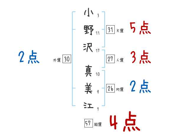 天運![]() | 小野沢真美江さんの天運は31画の5つ星!社交性があり判断力に優れる。順風満帆な人生で円満な生活。 家系が持つ宿命的な運勢を表します。祖先から受け継いだ苗字ですので自分の力が及びません。家柄を象徴します。 |