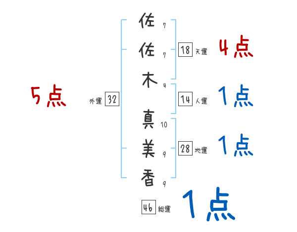 外運![]() | 佐佐木真美香さんの外運は32画の5つ星!柔軟性があり成功する。チャンスが多く金運が良い。 生活面を象徴する運勢です。外部から受ける影響力を表し、結婚運、家庭運や職場、環境への順応性を表します。 |