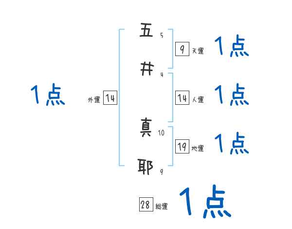 総運![]() | 五井真耶さんの総運は28画の1つ星!家庭環境に注意。スポーツで活躍できる能力があるかも。 あなたの人生を表す1番重要な運勢です。生涯を通じて影響する総合運となり、主に50歳以降の晩年期に影響を及ぼします。 |
