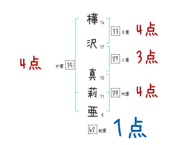 外運![]() | 樺沢真莉亜さんの外運は35画の4つ星!温厚な性格で感受性が高い。穏和な性格で人望が厚い。 生活面を象徴する運勢です。外部から受ける影響力を表し、結婚運、家庭運や職場、環境への順応性を表します。 |