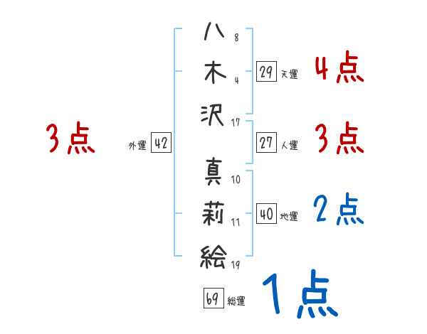 総運![]() | 八木沢真莉絵さんの総運は69画の1つ星!不満を感じやすい傾向が。ストレスを貯めないように注意しましょう。 あなたの人生を表す1番重要な運勢です。生涯を通じて影響する総合運となり、主に50歳以降の晩年期に影響を及ぼします。 |