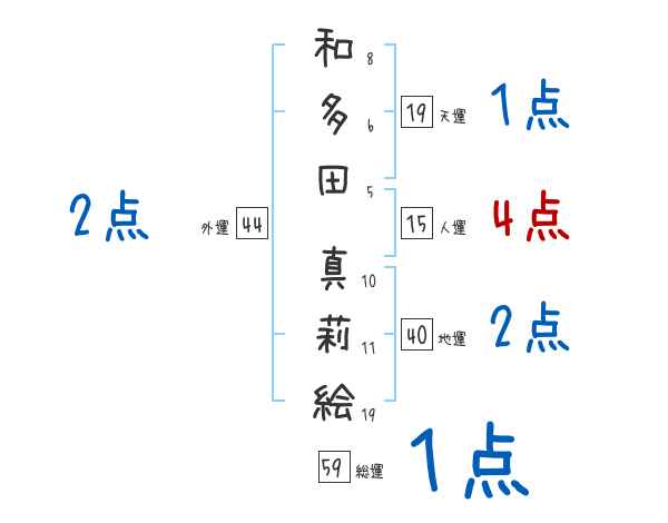 外運![]() | 和多田真莉絵さんの外運は44画の2つ星!誠実で慎重な性格。物事を考えすぎないように注意しましょう。 生活面を象徴する運勢です。外部から受ける影響力を表し、結婚運、家庭運や職場、環境への順応性を表します。 |