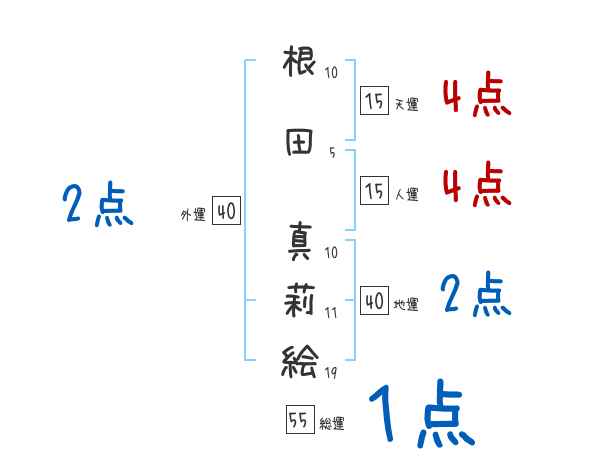 外運![]() | 根田真莉絵さんの外運は40画の2つ星!自信過剰で物事に固執するためトラブルに注意。 生活面を象徴する運勢です。外部から受ける影響力を表し、結婚運、家庭運や職場、環境への順応性を表します。 |