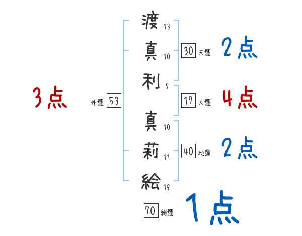 外運![]() | 渡真利真莉絵さんの外運は53画の3つ星!やや見栄っ張りで虚栄心がある。散財に注意。 生活面を象徴する運勢です。外部から受ける影響力を表し、結婚運、家庭運や職場、環境への順応性を表します。 |