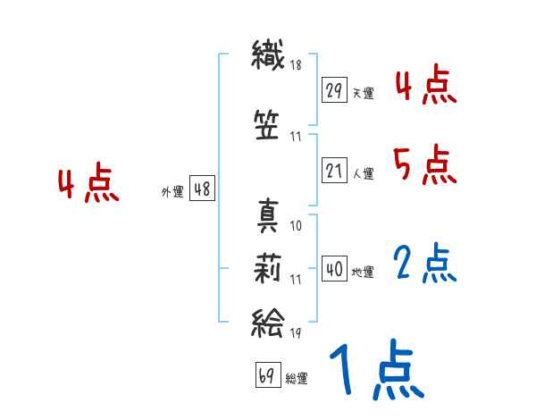 総運![]() | 織笠真莉絵さんの総運は69画の1つ星!不満を感じやすい傾向が。ストレスを貯めないように注意しましょう。 あなたの人生を表す1番重要な運勢です。生涯を通じて影響する総合運となり、主に50歳以降の晩年期に影響を及ぼします。 |