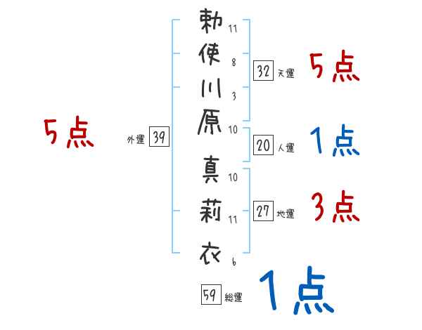 天運![]() | 勅使川原真莉衣さんの天運は32画の5つ星!柔軟性があり成功する。チャンスが多く金運が良い。 家系が持つ宿命的な運勢を表します。祖先から受け継いだ苗字ですので自分の力が及びません。家柄を象徴します。 |