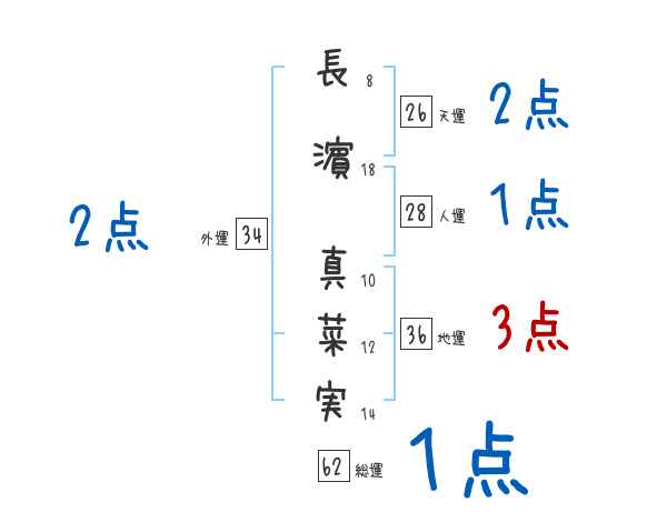 天運![]() | 長濵真菜実さんの天運は26画の2つ星!波瀾万丈かも。信頼できる人を大事にしましょう。 家系が持つ宿命的な運勢を表します。祖先から受け継いだ苗字ですので自分の力が及びません。家柄を象徴します。 |