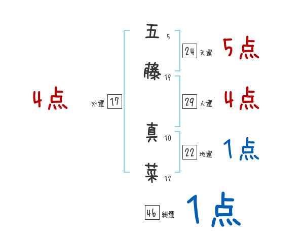 外運![]() | 五藤真菜さんの外運は17画の4つ星!積極的な行動力。地位を気づき財産を手に入れる。純粋な心と直感力。 生活面を象徴する運勢です。外部から受ける影響力を表し、結婚運、家庭運や職場、環境への順応性を表します。 |