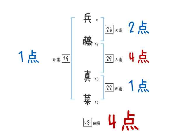 外運![]() | 兵藤真菜さんの外運は19画の1つ星!優れた才能を持ちますが、協調性が足りないことも。周りの人と協力する事を意識しましょう。 生活面を象徴する運勢です。外部から受ける影響力を表し、結婚運、家庭運や職場、環境への順応性を表します。 |