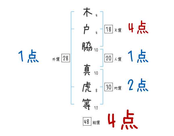 天運![]() | 木戸脇真虎等さんの天運は18画の4つ星!情熱的で剛気。忍耐力があり信頼される。 家系が持つ宿命的な運勢を表します。祖先から受け継いだ苗字ですので自分の力が及びません。家柄を象徴します。 |