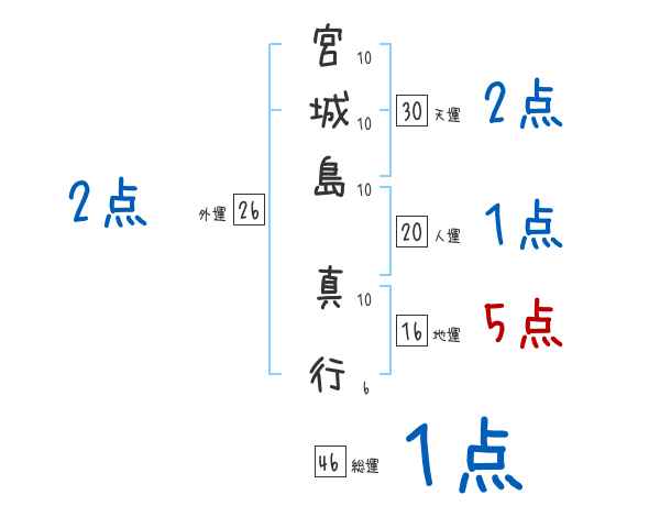 天運![]() | 宮城島真行さんの天運は30画の2つ星!浮き沈みの激しさに注意しましょう。 家系が持つ宿命的な運勢を表します。祖先から受け継いだ苗字ですので自分の力が及びません。家柄を象徴します。 |