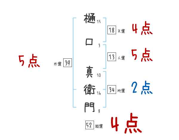 外運![]() | 樋口真衛門さんの外運は39画の5つ星!社交性に優れ人望が厚い。人の上に立ち成功する。 生活面を象徴する運勢です。外部から受ける影響力を表し、結婚運、家庭運や職場、環境への順応性を表します。 |