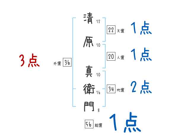 外運![]() | 清原真衛門さんの外運は36画の3つ星!先見性が豊かです。多少神経質で苦労することも。 生活面を象徴する運勢です。外部から受ける影響力を表し、結婚運、家庭運や職場、環境への順応性を表します。 |