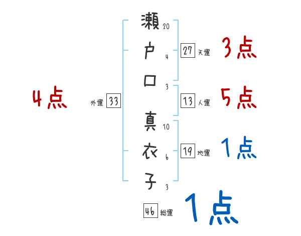 天運![]() | 瀬戸口真衣子さんの天運は27画の3つ星!頭脳明晰だが強情で摩擦が多い傾向。孤立に注意。 家系が持つ宿命的な運勢を表します。祖先から受け継いだ苗字ですので自分の力が及びません。家柄を象徴します。 |