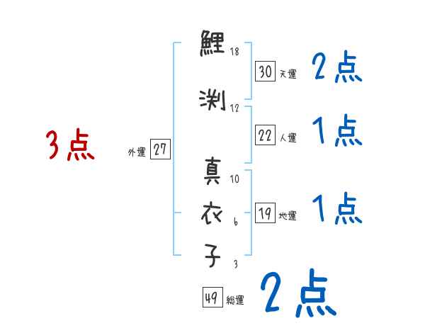 人運![]() | 鯉渕真衣子さんの人運は22画の1つ星!努力することが苦手ないっぽう手先が器用。芸術性にも優れる。 性格や才能などを表す2番目に重要な運勢です。人間関係や協調性、社会的な成功に影響します。主に20歳から50歳ぐらいまでの中年期の運勢を表します。 |