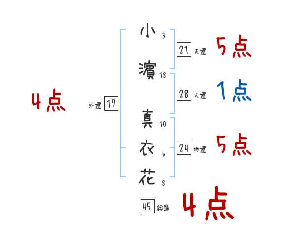 天運![]() | 小濵真衣花さんの天運は21画の5つ星!統率力がある。独立し成功する。名誉を手に入れる。 家系が持つ宿命的な運勢を表します。祖先から受け継いだ苗字ですので自分の力が及びません。家柄を象徴します。 |