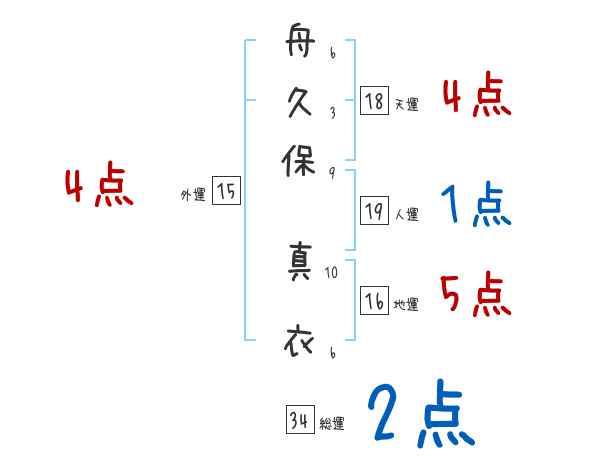 天運![]() | 舟久保真衣さんの天運は18画の4つ星!情熱的で剛気。忍耐力があり信頼される。 家系が持つ宿命的な運勢を表します。祖先から受け継いだ苗字ですので自分の力が及びません。家柄を象徴します。 |