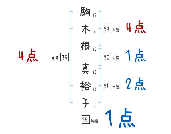 外運![]() | 駒木根真裕子さんの外運は35画の4つ星!温厚な性格で感受性が高い。穏和な性格で人望が厚い。 生活面を象徴する運勢です。外部から受ける影響力を表し、結婚運、家庭運や職場、環境への順応性を表します。 |
