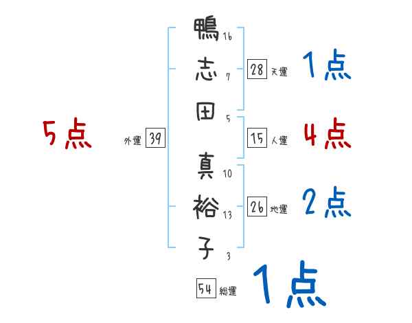 総運![]() | 鴨志田真裕子さんの総運は54画の1つ星!トラブルが多いかも。周りをよく見て協調して過ごしましょう。 あなたの人生を表す1番重要な運勢です。生涯を通じて影響する総合運となり、主に50歳以降の晩年期に影響を及ぼします。 |