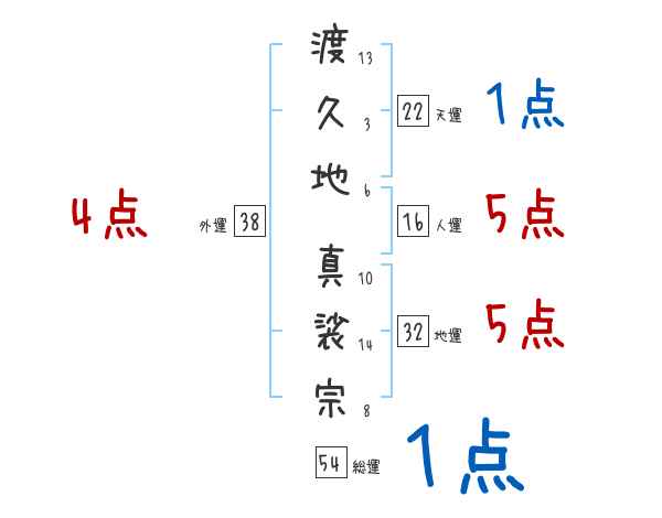 総運![]() | 渡久地真裟宗さんの総運は54画の1つ星!トラブルが多いかも。周りをよく見て協調して過ごしましょう。 あなたの人生を表す1番重要な運勢です。生涯を通じて影響する総合運となり、主に50歳以降の晩年期に影響を及ぼします。 |