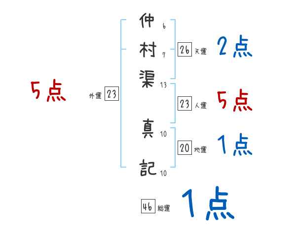 天運![]() | 仲村渠真記さんの天運は26画の2つ星!波瀾万丈かも。信頼できる人を大事にしましょう。 家系が持つ宿命的な運勢を表します。祖先から受け継いだ苗字ですので自分の力が及びません。家柄を象徴します。 |