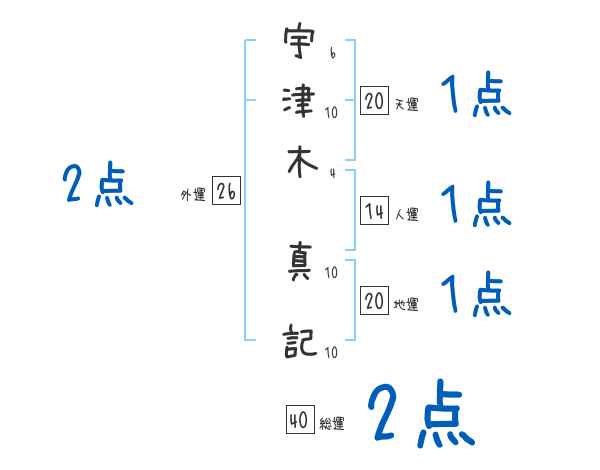 外運![]() | 宇津木真記さんの外運は26画の2つ星!波瀾万丈かも。信頼できる人を大事にしましょう。 生活面を象徴する運勢です。外部から受ける影響力を表し、結婚運、家庭運や職場、環境への順応性を表します。 |