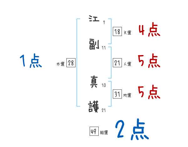 総運![]() | 江副真護さんの総運は49画の2つ星!不安定な性格で明暗がある人生。周りの人には支援されやすい。 あなたの人生を表す1番重要な運勢です。生涯を通じて影響する総合運となり、主に50歳以降の晩年期に影響を及ぼします。 |