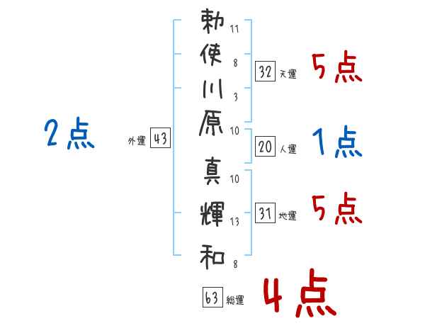 天運![]() | 勅使川原真輝和さんの天運は32画の5つ星!柔軟性があり成功する。チャンスが多く金運が良い。 家系が持つ宿命的な運勢を表します。祖先から受け継いだ苗字ですので自分の力が及びません。家柄を象徴します。 |