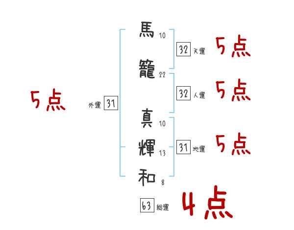 人運![]() | 馬籠真輝和さんの人運は32画の5つ星!柔軟性があり成功する。チャンスが多く金運が良い。 性格や才能などを表す2番目に重要な運勢です。人間関係や協調性、社会的な成功に影響します。主に20歳から50歳ぐらいまでの中年期の運勢を表します。 |