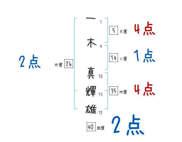 天運![]() | 一木真輝雄さんの天運は5画の4つ星!健康で安泰。協調性に優れ、財産に恵まれる。 家系が持つ宿命的な運勢を表します。祖先から受け継いだ苗字ですので自分の力が及びません。家柄を象徴します。 |