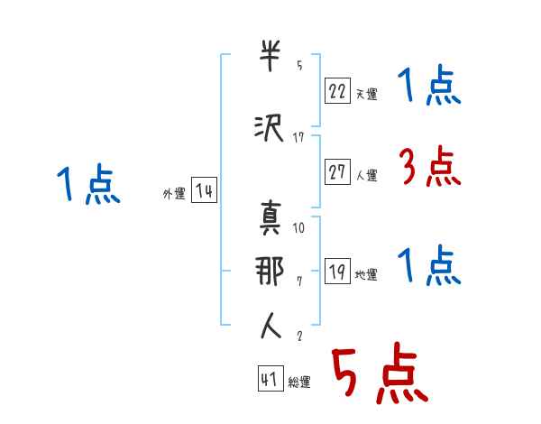 天運![]() | 半沢真那人さんの天運は22画の1つ星!努力することが苦手ないっぽう手先が器用。芸術性にも優れる。 家系が持つ宿命的な運勢を表します。祖先から受け継いだ苗字ですので自分の力が及びません。家柄を象徴します。 |