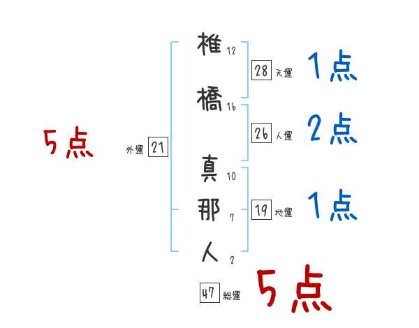 総運![]() | 椎橋真那人さんの総運は47画の5つ星!実力が開花し発展する円満な人生。財に恵まれる。 あなたの人生を表す1番重要な運勢です。生涯を通じて影響する総合運となり、主に50歳以降の晩年期に影響を及ぼします。 |