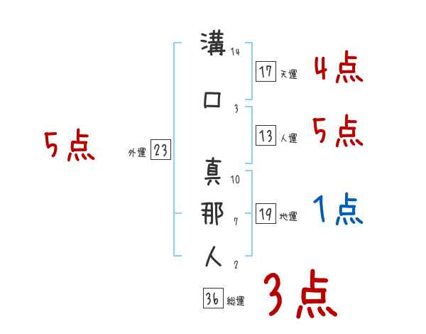 外運![]() | 溝口真那人さんの外運は23画の5つ星!想像力に優れ活力がある。一代で成功し名誉を手に入れる。 生活面を象徴する運勢です。外部から受ける影響力を表し、結婚運、家庭運や職場、環境への順応性を表します。 |