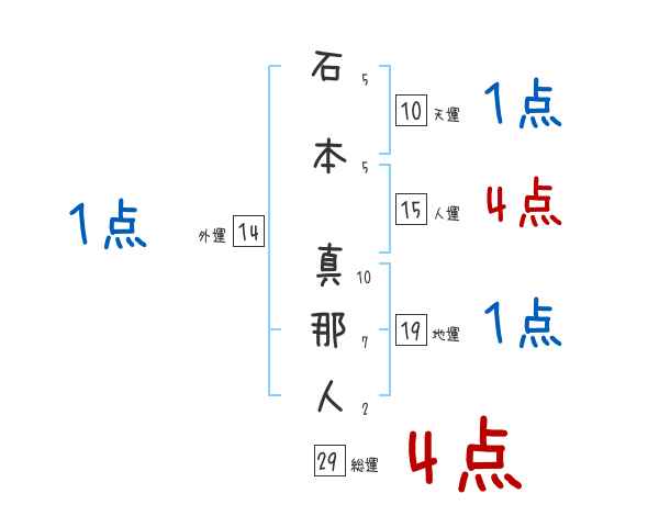 天運![]() | 石本真那人さんの天運は10画の1つ星!不安を感じやすい傾向。ストレスを抱えないように注意しましょう。 家系が持つ宿命的な運勢を表します。祖先から受け継いだ苗字ですので自分の力が及びません。家柄を象徴します。 |