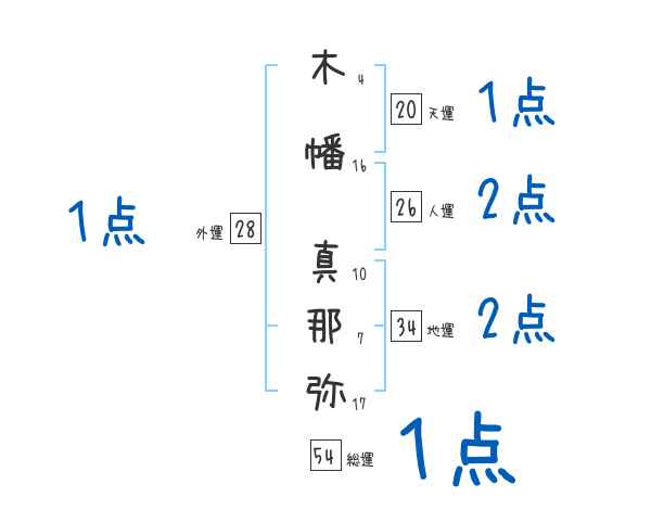 総運![]() | 木幡真那弥さんの総運は54画の1つ星!トラブルが多いかも。周りをよく見て協調して過ごしましょう。 あなたの人生を表す1番重要な運勢です。生涯を通じて影響する総合運となり、主に50歳以降の晩年期に影響を及ぼします。 |