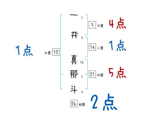 天運![]() | 一井真那斗さんの天運は5画の4つ星!健康で安泰。協調性に優れ、財産に恵まれる。 家系が持つ宿命的な運勢を表します。祖先から受け継いだ苗字ですので自分の力が及びません。家柄を象徴します。 |